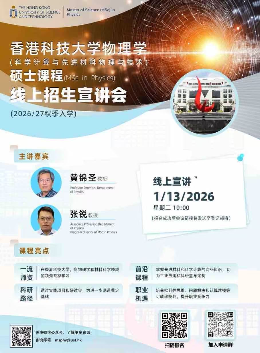 香港科技大学物理学(科学计算与先进材料物理与技术)理学硕士线上招生宣讲会